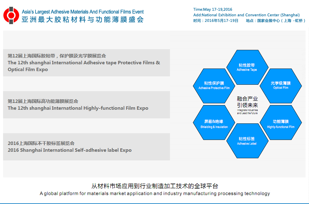 作为亚洲最大规模及影响力的胶粘材料与功能薄膜年度盛会,第12届上海国际胶粘带、保护膜及光学膜展览会 & 第12届上海国际高功能薄膜展览会[简称APFE],定于2016年5月17-19日在国家会展中心(上海虹桥)举办。本届展览面积拟定26,000平方米,设置1,300个国际标准展位,预计将云集中外品牌展商达600多家,宏大的规模阵容与国际影响力将成为历届之最!