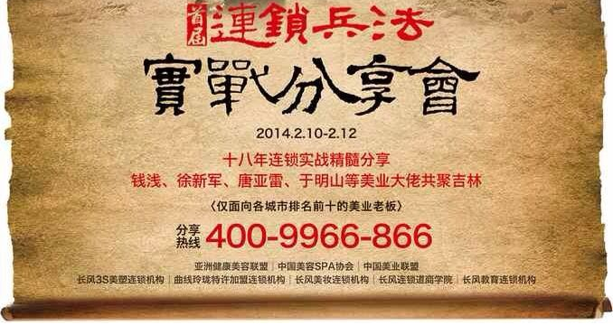 长风首届连锁兵法实战分享会,现面向各市县排名前15的美业同仁免费开放。一个机会,也许就能成就属于您的2014!一个成功的2014,也许就能从此改变您的事业和人生!2014年2月10至2月12日,精彩尽在吉林市!